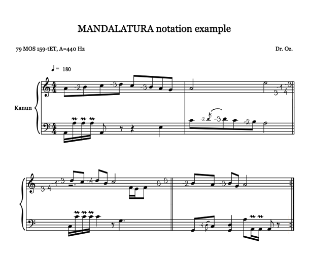 To immediately start composing in 79-tone detail using Mandalatura, you can acquire a Mus2 template file of the above score and its integer accidentals palette from this link.