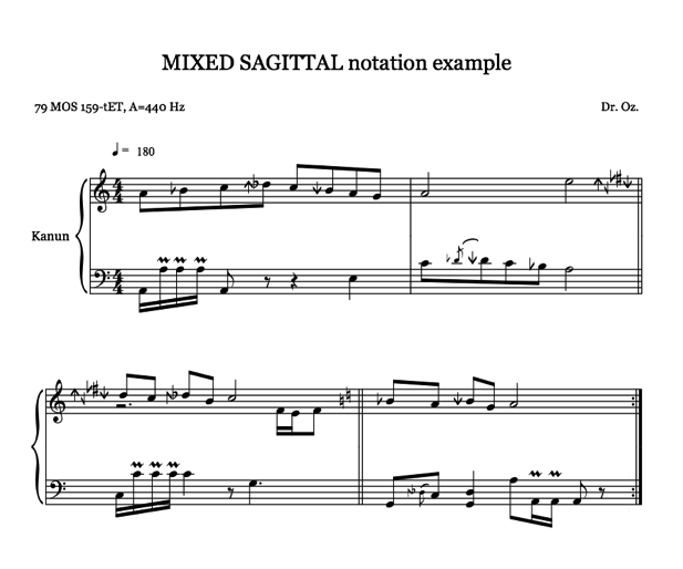 Provided below is an example in Saba notated using the Mixed Sagittal Microtonal Notation System for 79 MOS 159-tET followed by its matching Mandalatura counterpart.