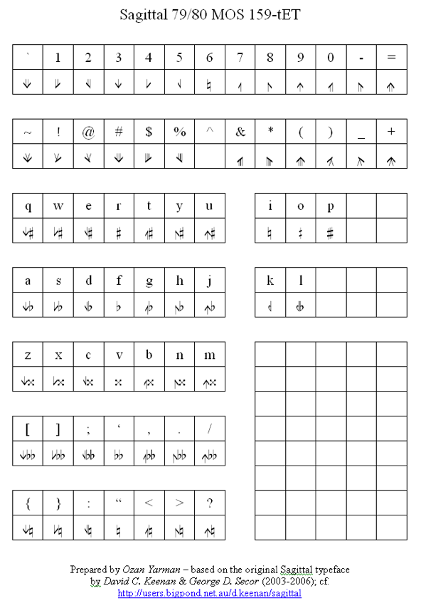 In order to notate 79 MOS 159-tET, I have adapted the Sagittal Microtonal Notation System developed by George Secor and David Keenan to my own 79 pitches. Click here to download a special MIXED-SAGITTAL font featuring all the accidentals in the 79-tone tuning. Additionally, a Mus2 template file to get started composing with this font right away is available at this link.