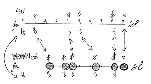 Yarman-36’nın notasyonu ile AEU notasyonunun karşılaştırmasını yaptığımızda, ilaveten bir diyez ve bemolden başka arızi işarete lüzum olmadığı görülecektir: