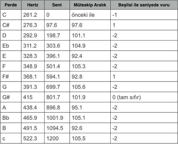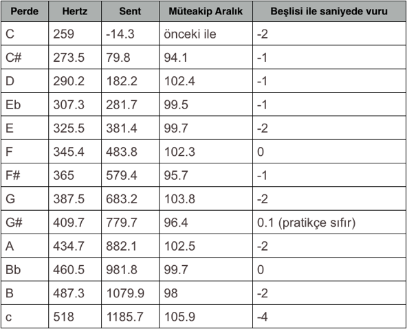Önce 6:5’i ayarlayalım. Sonra, bu aralığı biraz genişletecek şekilde bozalım. Tekrar 6:5’e yaklaşırken vuruları dinleyelim. Saniyede 3 vuru meydana geldiğinde, ikinci katmanın E sesi bulunmuş olacak. İkinci katmanın bütün diğer seslerini bu E’ye göre, beşlilerin vurularını dinleyerek bulacağız.
